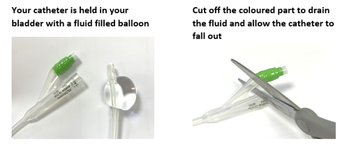 The catheter stays in place by inflating a balloon, filled with water, inside the bladder. During the TWOC the nurse will deflate the balloon using an empty syringe and gently withdraw the catheter out of the urine pipe.